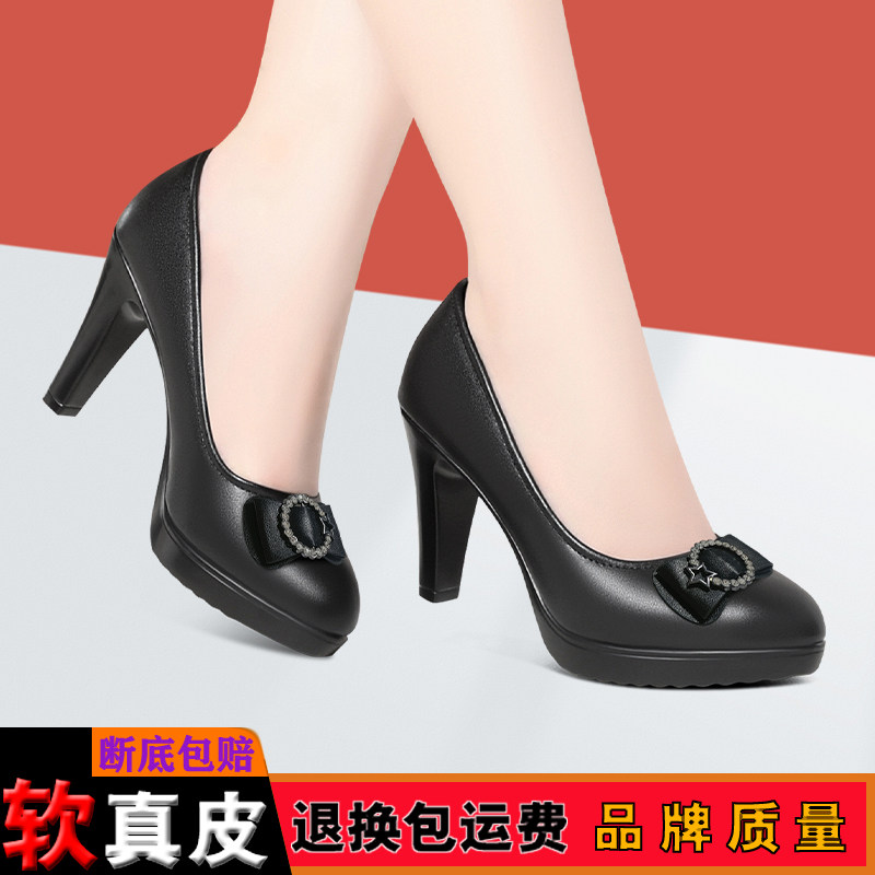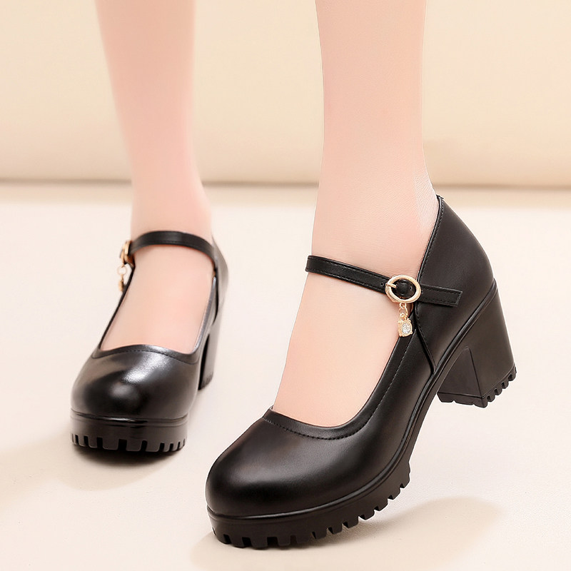 中老年旗袍走秀高跟鞋女真皮粗跟皮鞋圆头职业防水台厚底黑色单鞋