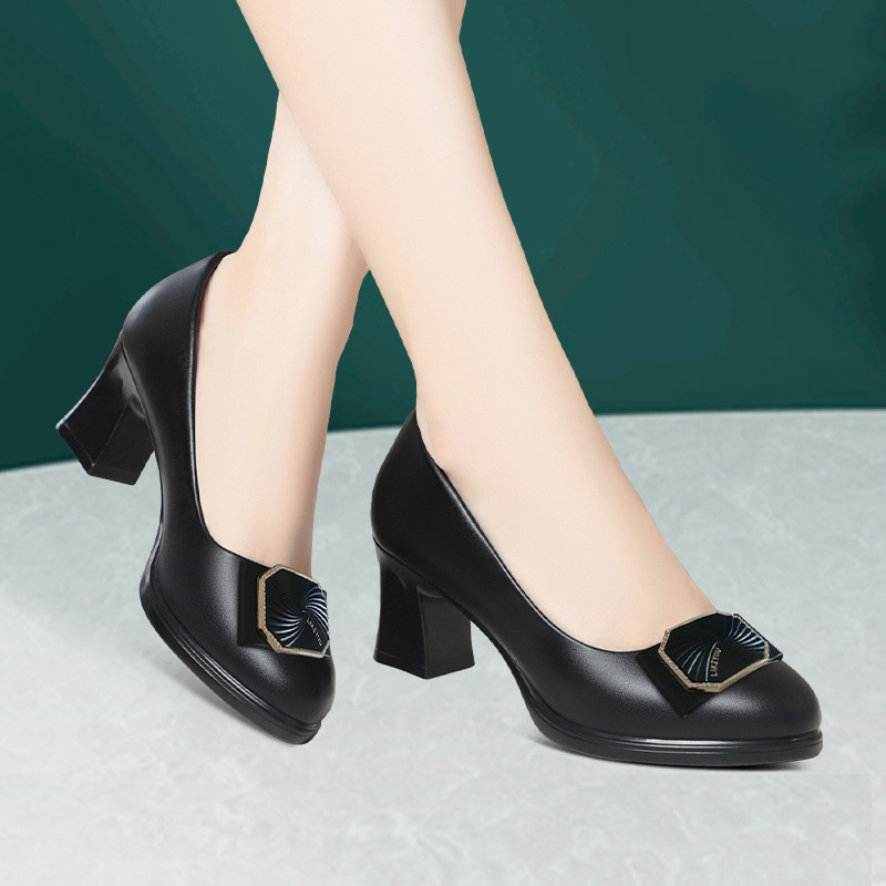 中老年旗袍走秀高跟鞋气质粗跟防水皮鞋浅口百搭单鞋软底通勤女鞋