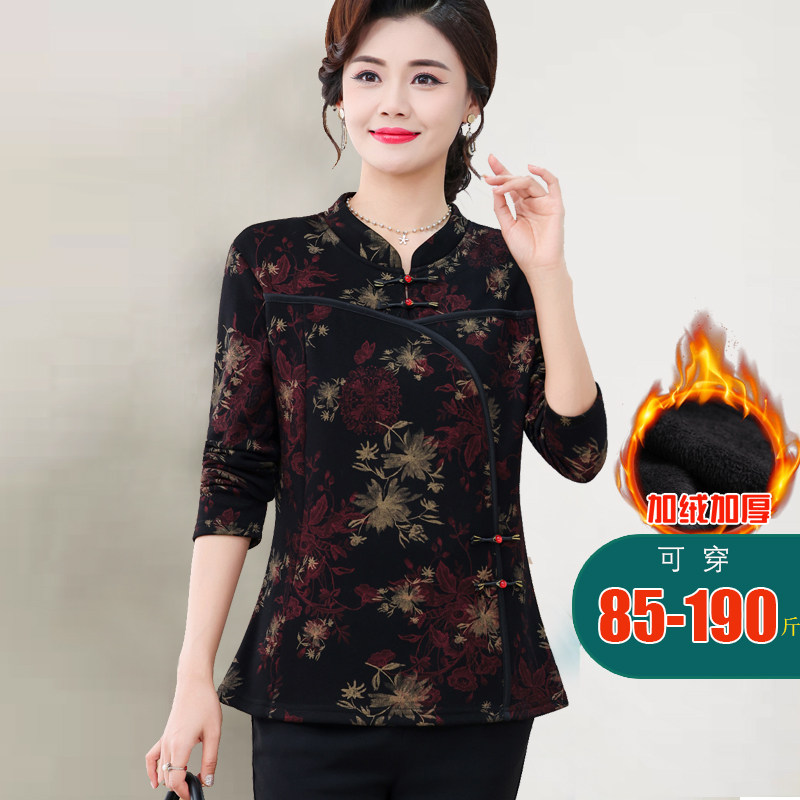 新中式旗袍上衣秋冬新款加绒小衫中老年妈妈德绒碎花翻领长袖体恤