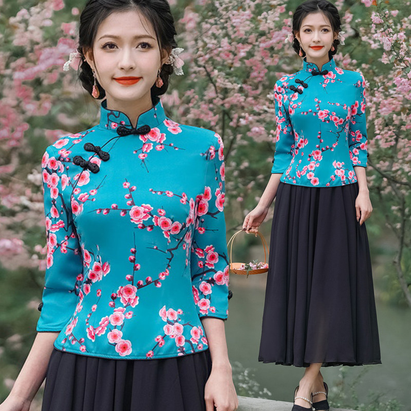 中老年旗袍两件套精美印花梅花清新优雅古韵中式妈妈旗袍女式上衣