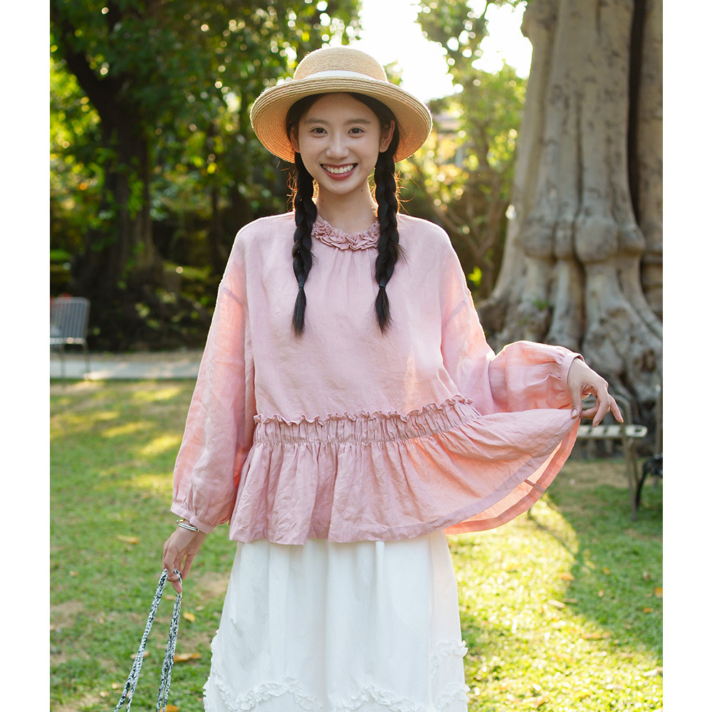 古苔 粉色木耳边衬衫100亚麻宽松灯笼袖重工娃娃衫春日花仙子上衣