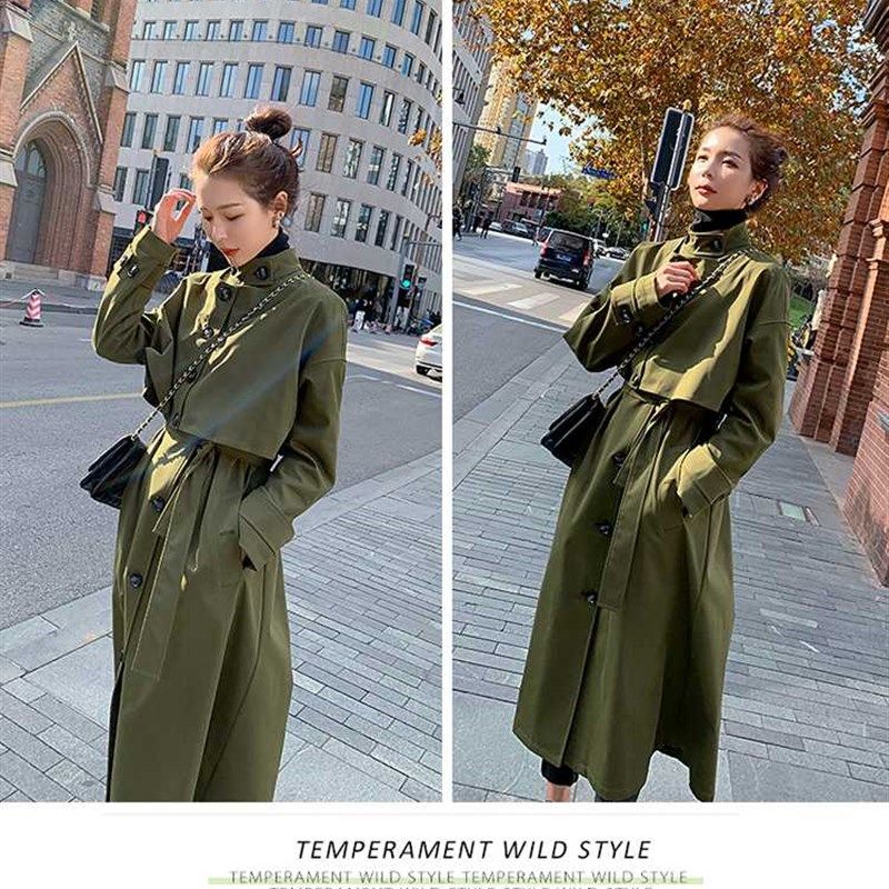 2021军绿色卡其色秋季新款 现货 欧韩时尚长款显瘦风衣外套 腰控
