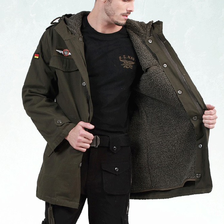 M51中长款风衣男绗缝内胆保暖军绿色美式复古棉服大衣连帽外套