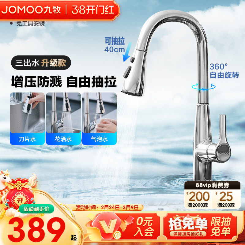 九牧官方旗舰厨房水龙头304不锈钢洗菜盆冷热抽拉式龙头防溅伸缩