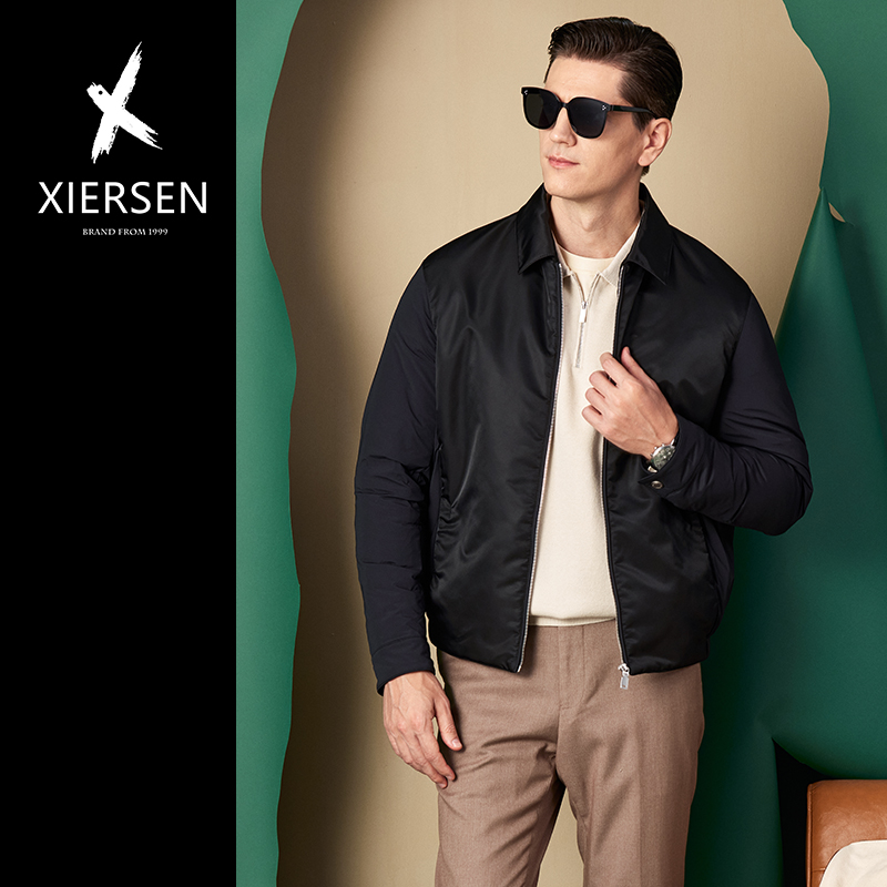 冬欧洲站再生尼龙拼接风格翻领鹅绒薄羽绒服男骆驼绒短款夹克外套