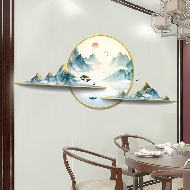 自粘墙贴画新中式山水画客厅沙发电视背景招财装饰画风景壁画贴纸