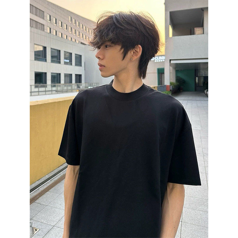 黑沧社/韩国黑色重磅垫肩短袖男夏季百搭打底衫纯色t恤高级感内搭