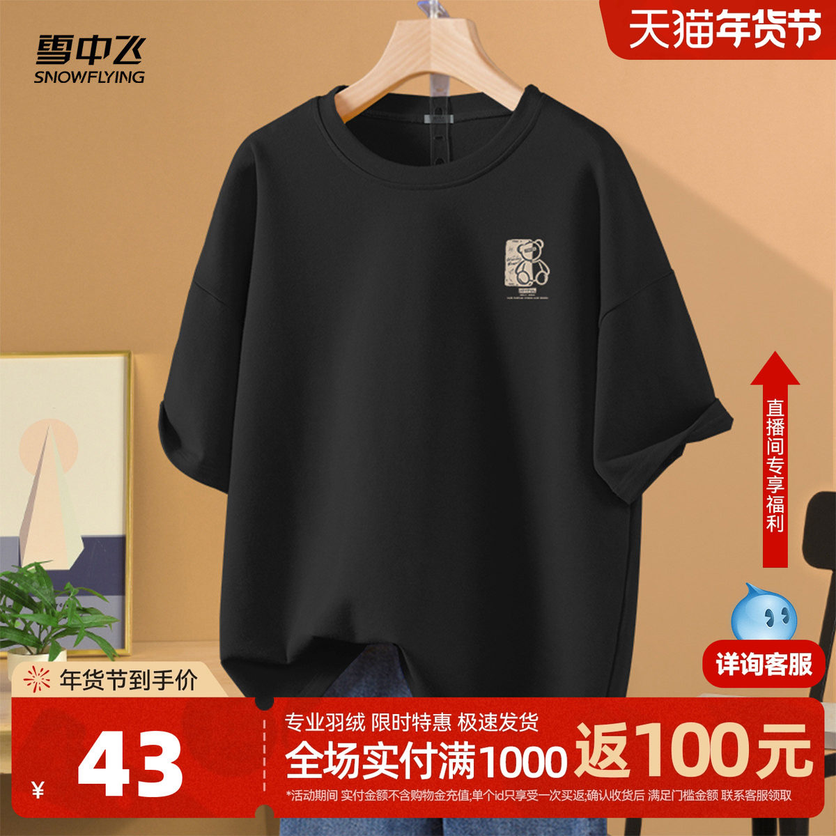 雪中飞短袖女t恤2026新款夏季薄款圆领打底衫黑色男女同款半袖PC