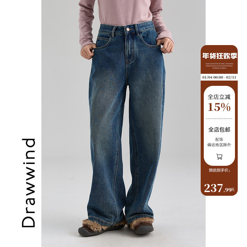 画风drawwind2025冬季新款萝卜裤女高腰显瘦休闲百搭植绒牛仔裤子
