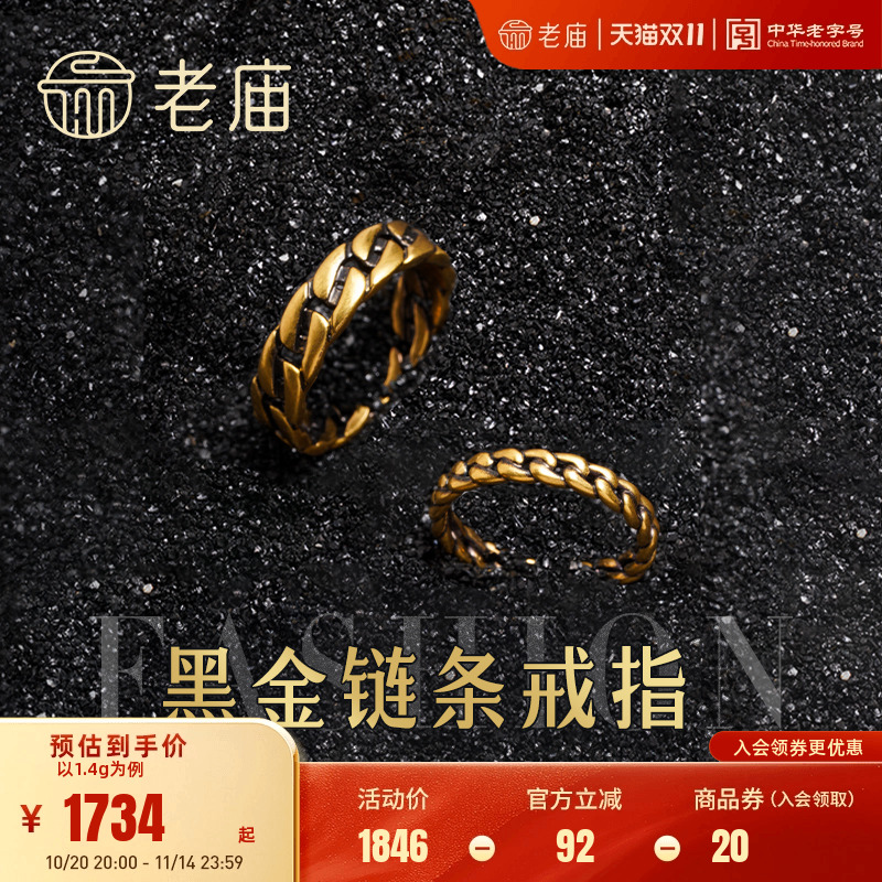 老庙黄金海豚金无氰硬金电黑固口足金戒指官方正品定价情侣送礼物