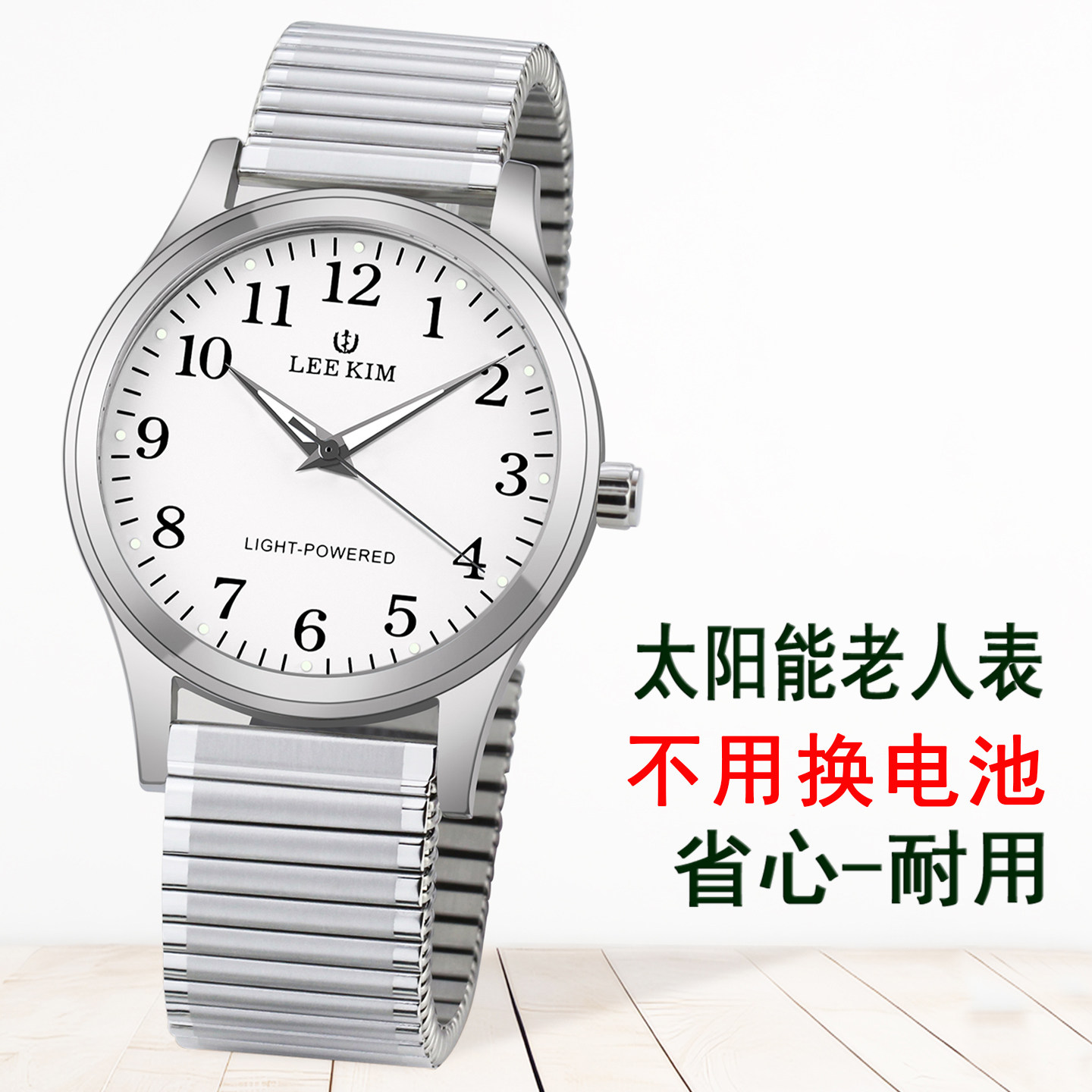 太阳能老人手表男款钢带松紧带大数字盘爸爸爷爷中老年人男光能表