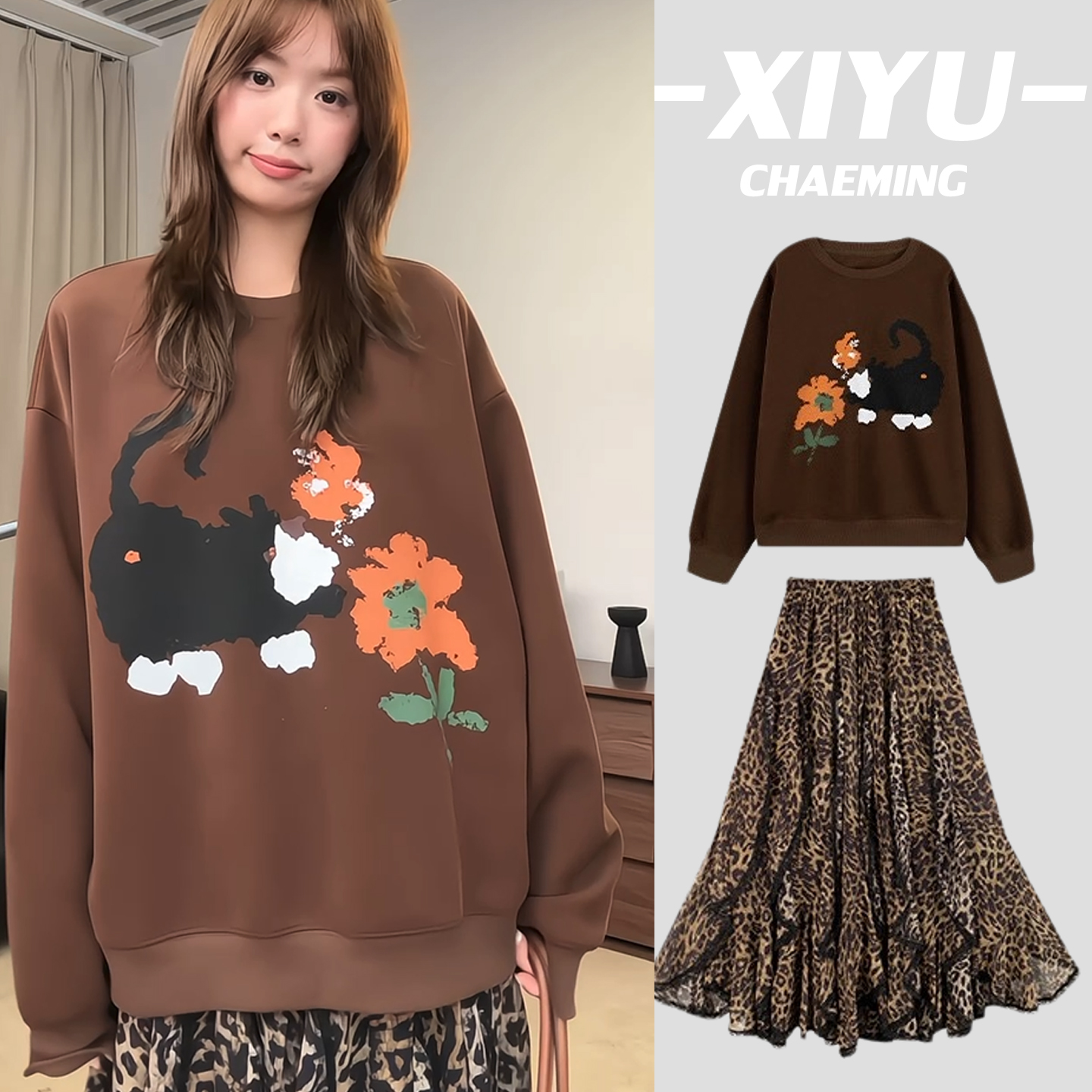 显瘦圆领套头卫衣复古小众时尚花边不对称荷叶边半身裙套装两件套