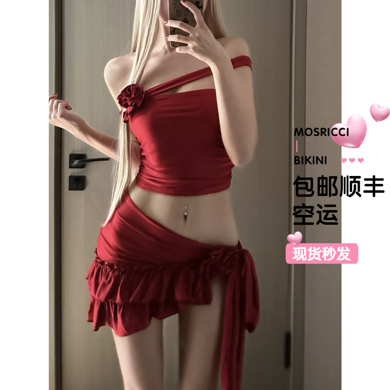 SylCue 圣诞节性感辣妹风露肩挂脖吊带背心蕾丝荷叶边半身裙套装