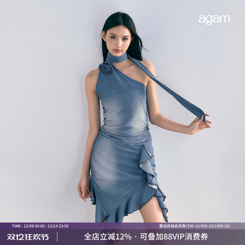 AGAM 原创设计纯欲风仿牛仔玫瑰挂脖背心+不规则荷叶边半身裙套装