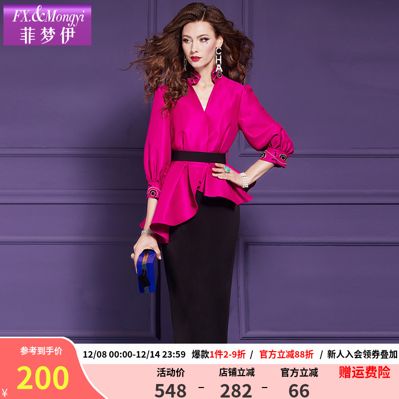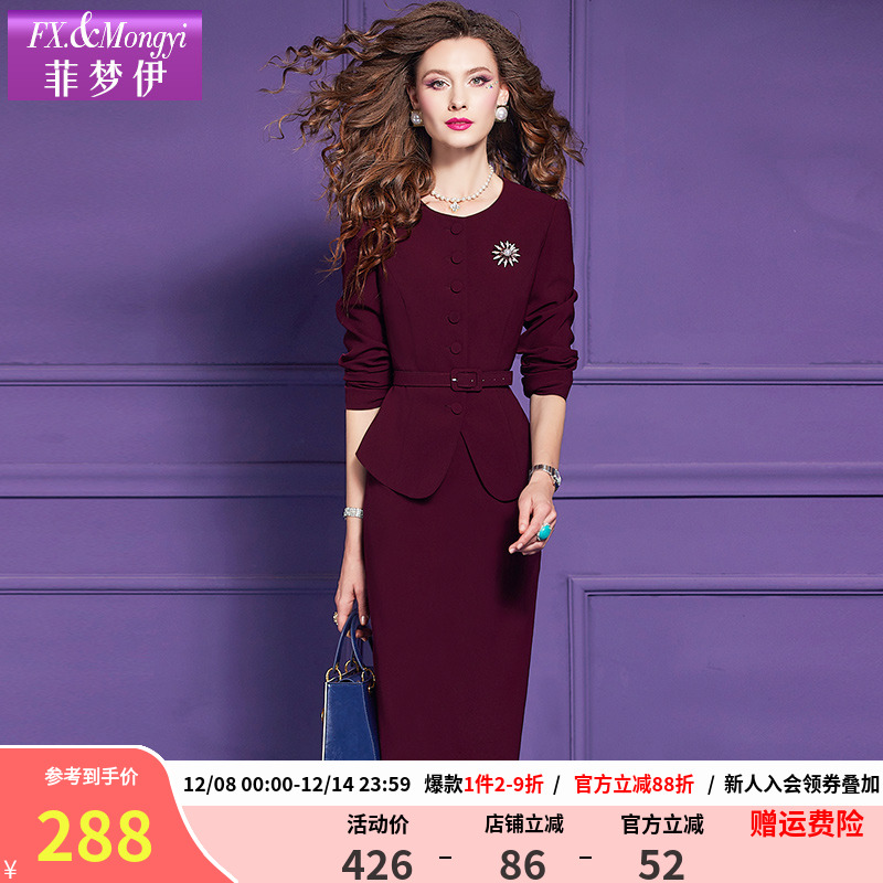 菲梦伊红色职业套装女秋季新款荷叶边轻奢高端气质上衣包臀半身裙