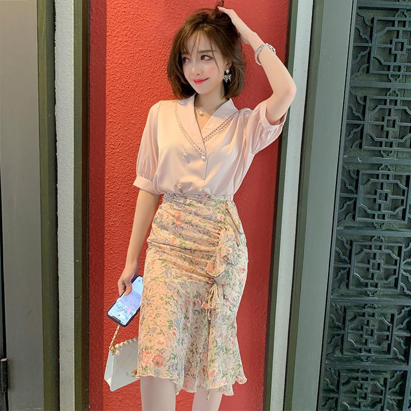 菲梦伊轻熟高级感时尚套装女夏季法式显瘦荷叶边衬衫印花半身裙子