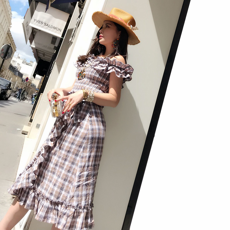 forevercan 时尚格子一字领上衣不规则荷叶边半身裙套装女