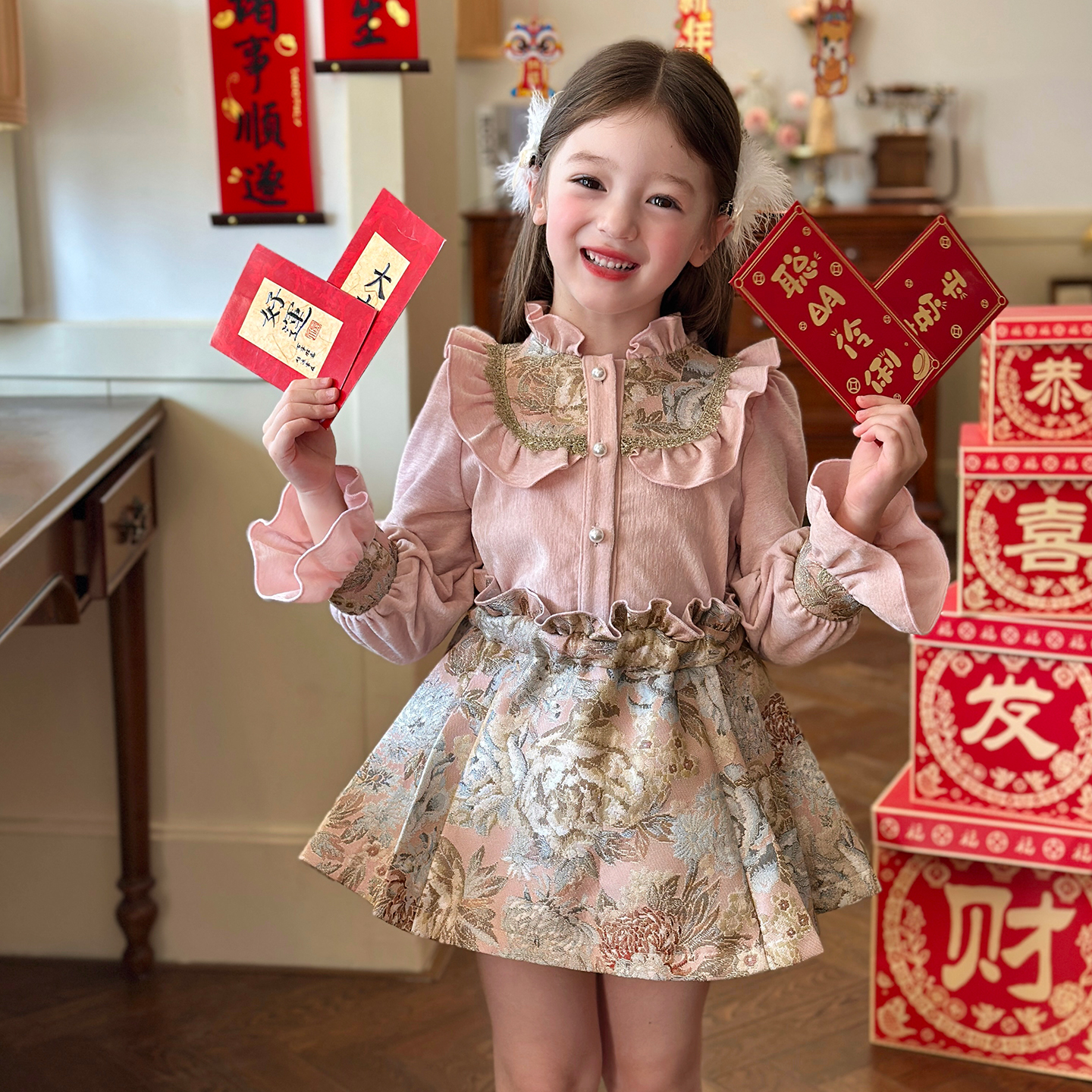 栀了成长记童装女童半身裙加绒套装2025冬季儿童国风荷叶边两件套