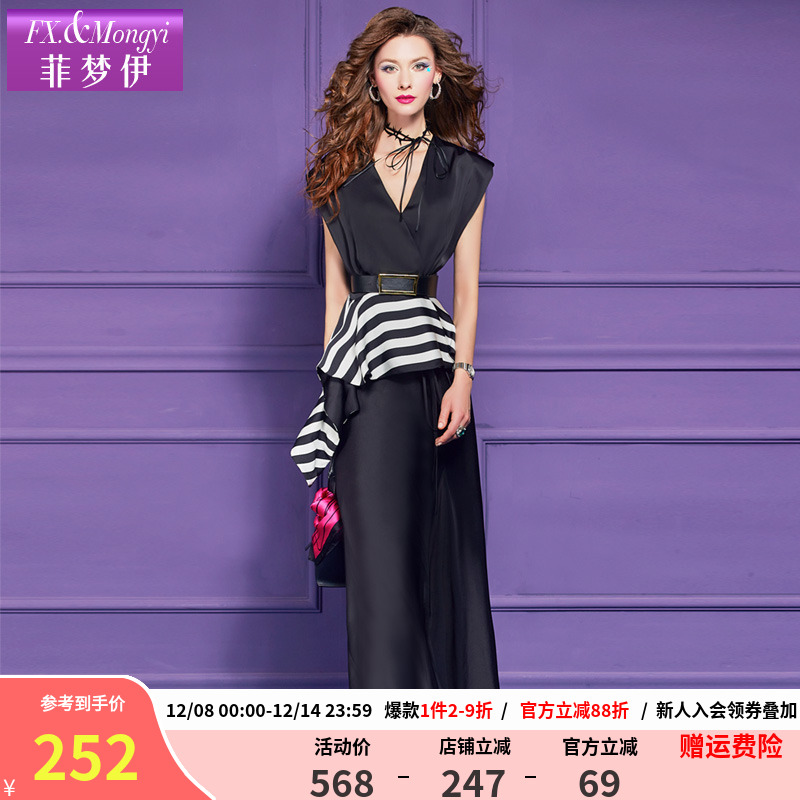 菲梦伊高级小众不撞款套装女夏季条纹荷叶边收腰V领上衣A字半身裙