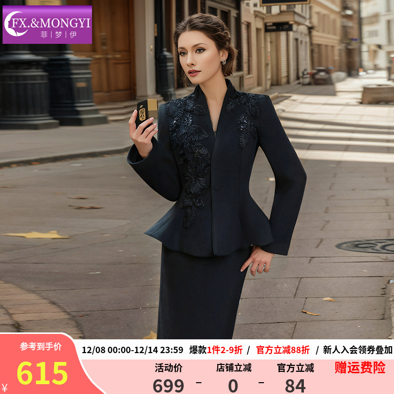 菲梦伊钉珠绣花黑色西装套装女冬季荷叶边收腰气质上衣包臀半身裙