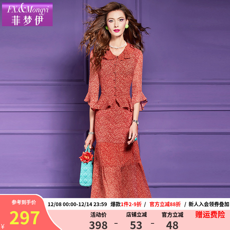 菲梦伊立体花朵红色时尚套装女秋季荷叶边设计感上衣鱼尾半身裙子