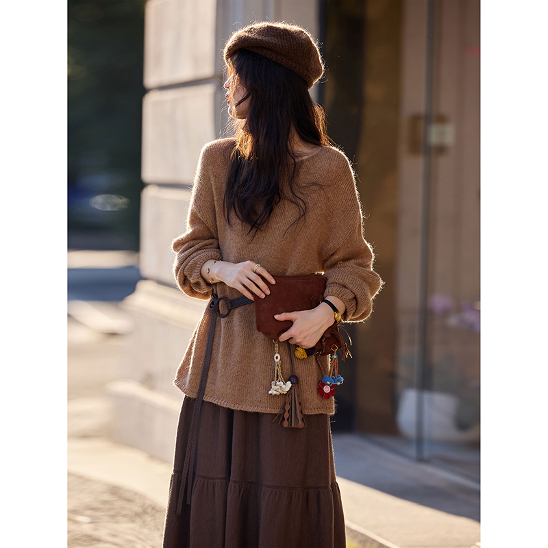苏醒的乐园秋季新品时尚配腰带气质针织毛衣拼接荷叶边半身裙套装