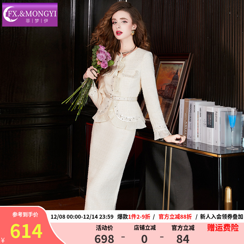 菲梦伊亮片小香风套装女冬季荷叶边名媛盘扣毛呢外套半身裙两件套