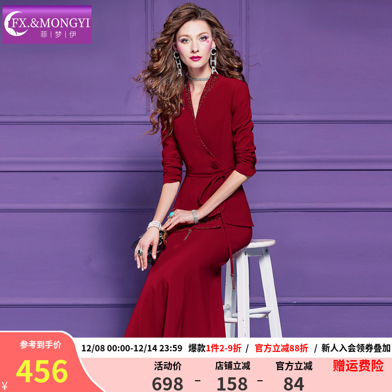 菲梦伊钉珠红色职业套装女秋季轻熟气质荷叶边西装上衣鱼尾半身裙