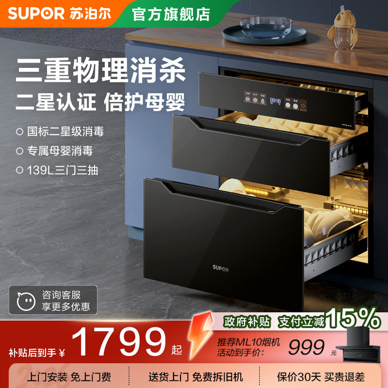 苏泊尔嵌入式消毒柜家用厨房三层大容量餐具消毒碗柜一体机MQ13