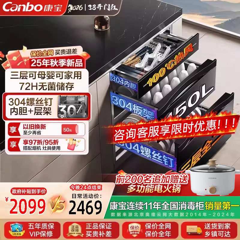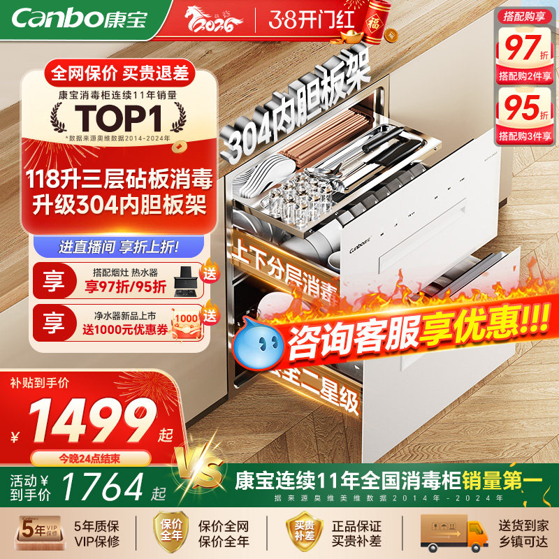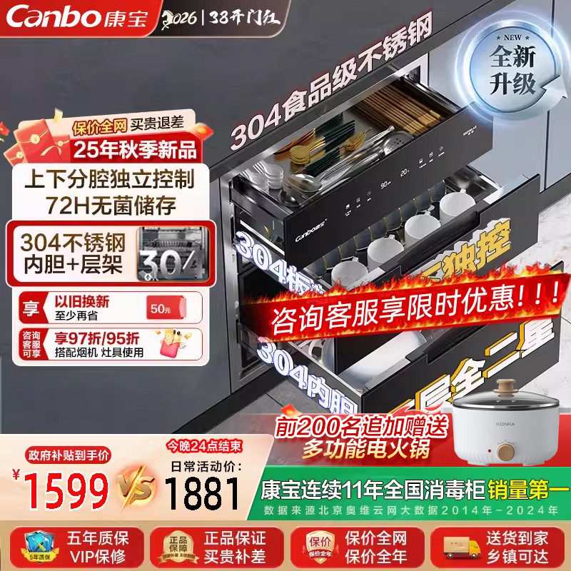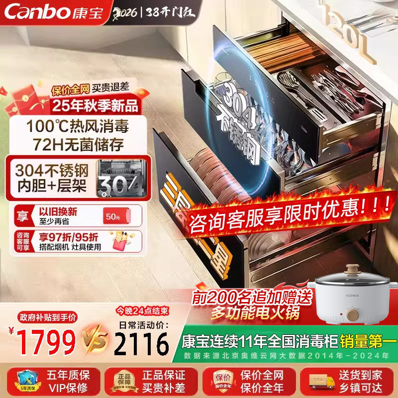 康宝嵌入式消毒柜全二星家用三门碗筷柜全腔304不锈钢25年新款AE