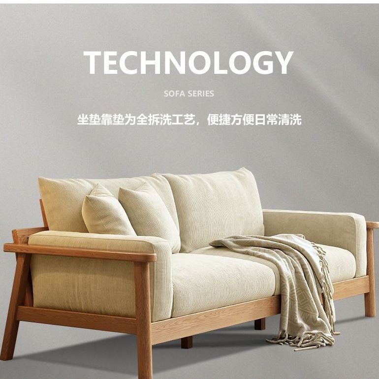 富创北欧日式实木沙发直排现代简约客厅小户型奶油风橡木布艺沙发