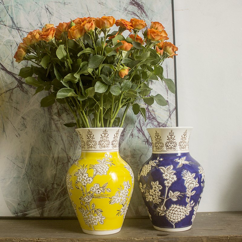 手工彩绘陶瓷g花瓶黄蓝色插花瓶覆古高级感水培养花瓷瓶客厅摆件
