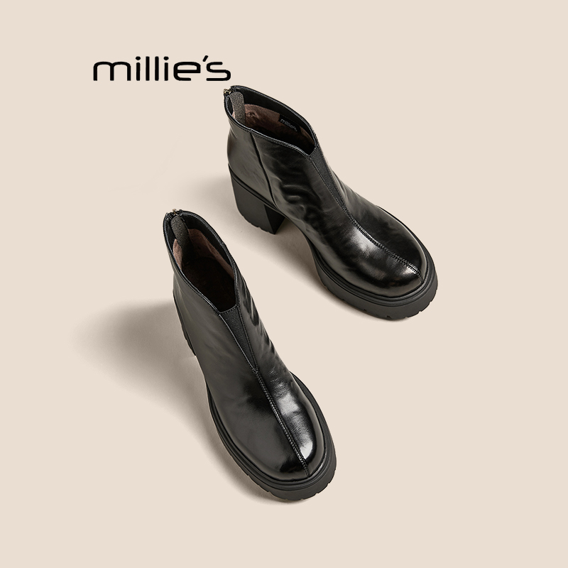 MILLIE'S/妙丽真皮高跟短靴冬季女新款加绒烟筒靴粗跟马丁靴黑色