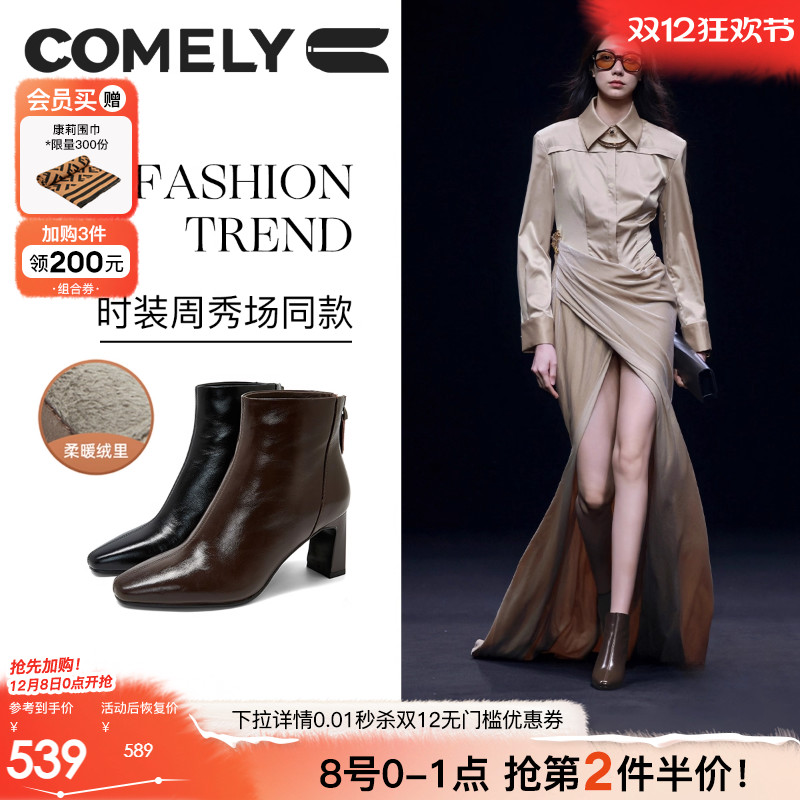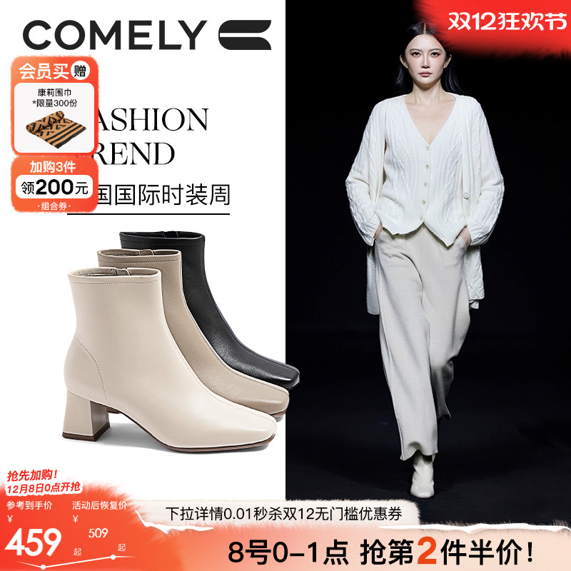 康莉羊皮粗跟短靴女冬季新款真皮时尚方头气质高跟时装靴黑色靴子