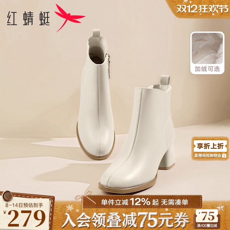 红蜻蜓白色真皮短靴女冬季新款加绒女鞋皮鞋高跟鞋子保暖妈妈靴子