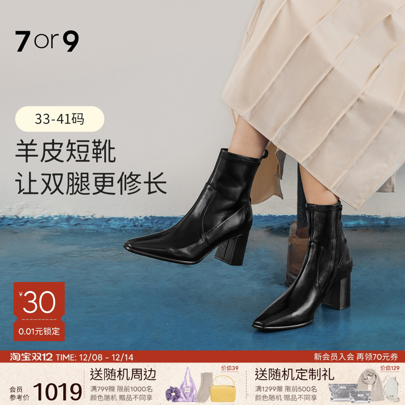 【静音系列】千百度粗高跟弹力靴女百搭冬季气质真皮瘦瘦袜靴短靴