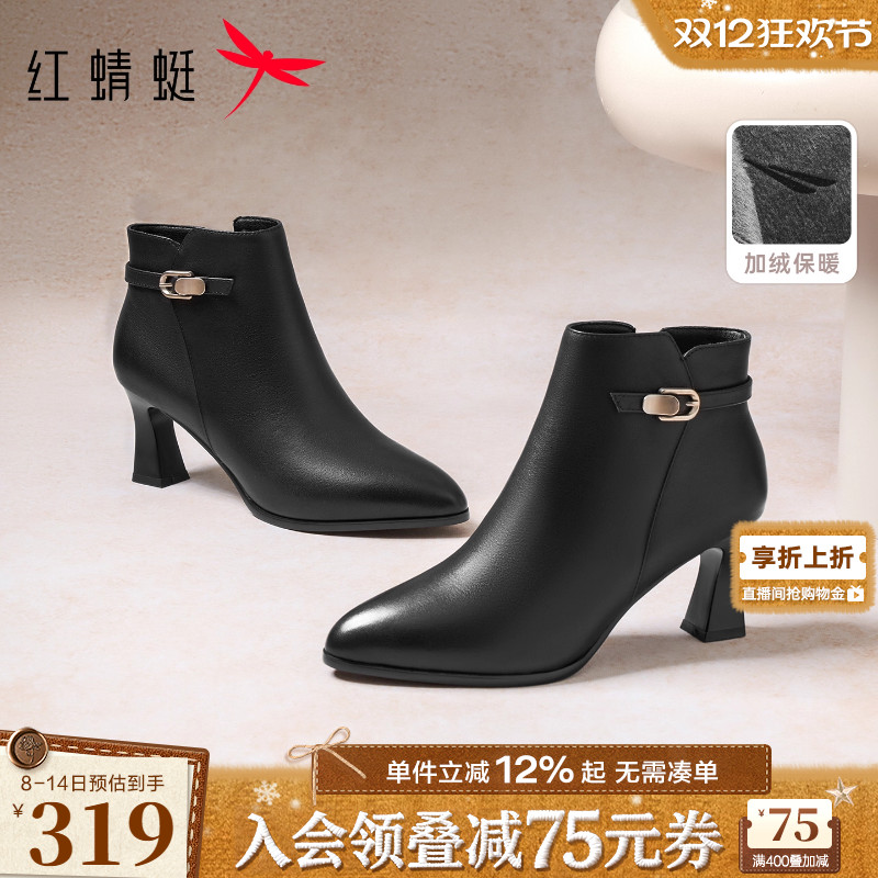 红蜻蜓高跟鞋2025冬季新款女鞋靴子细跟短靴真皮白色尖头皮鞋女靴