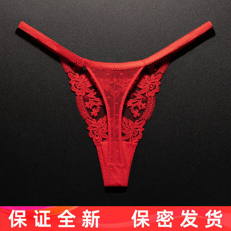 本命年大红色丁字裤女性感无痕蕾丝内裤火辣诱惑透明刺绣大码T裤