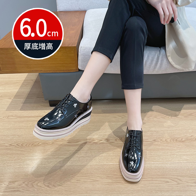 厚底小个子真皮方头女单鞋2024春季新款漆皮亮面松糕鞋系带熊猫鞋