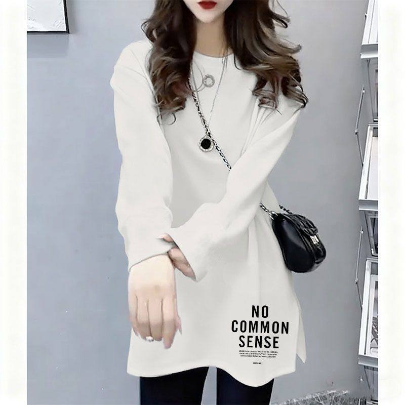 长袖t恤女中长款开叉磨毛秋冬纯棉宽松遮屁股配鲨鱼裤白色打底衫