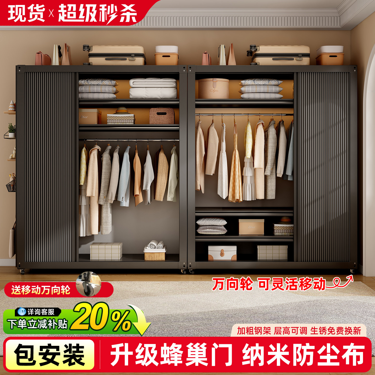 货架衣柜家用卧室出租房用简易组装金属洞洞板推拉门柜子儿童衣柜