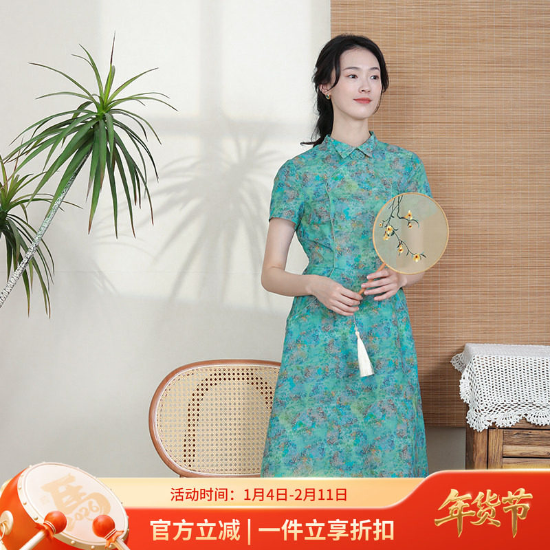 HUI卉新中式高竹生花非遗印花国风立领改良式旗袍式A摆连衣裙碎花