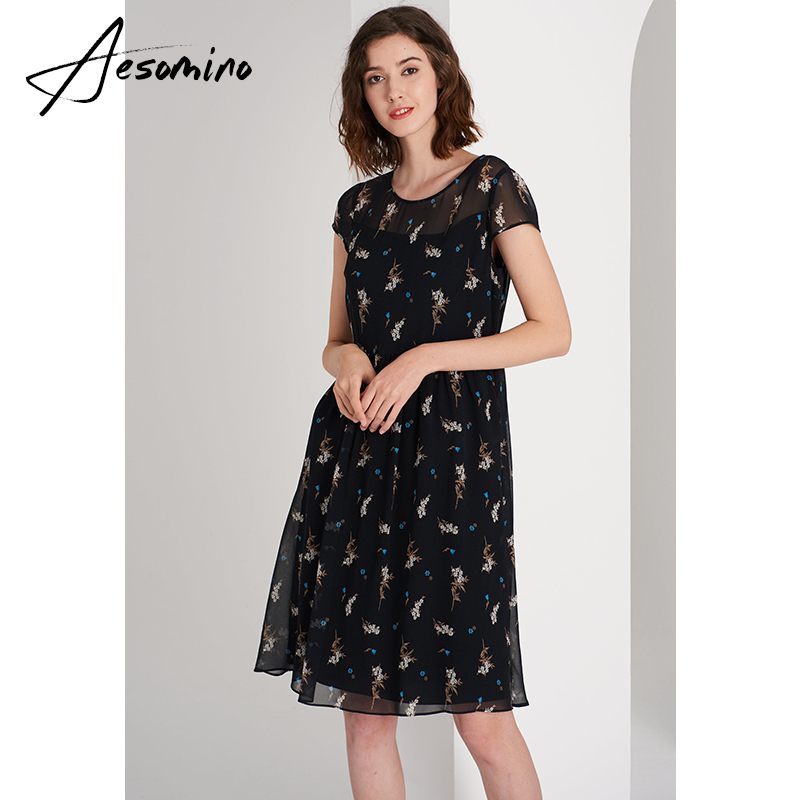 【特卖】高端衣莎美诺夏显瘦短袖桑蚕丝真丝连衣裙碎花黑62103225