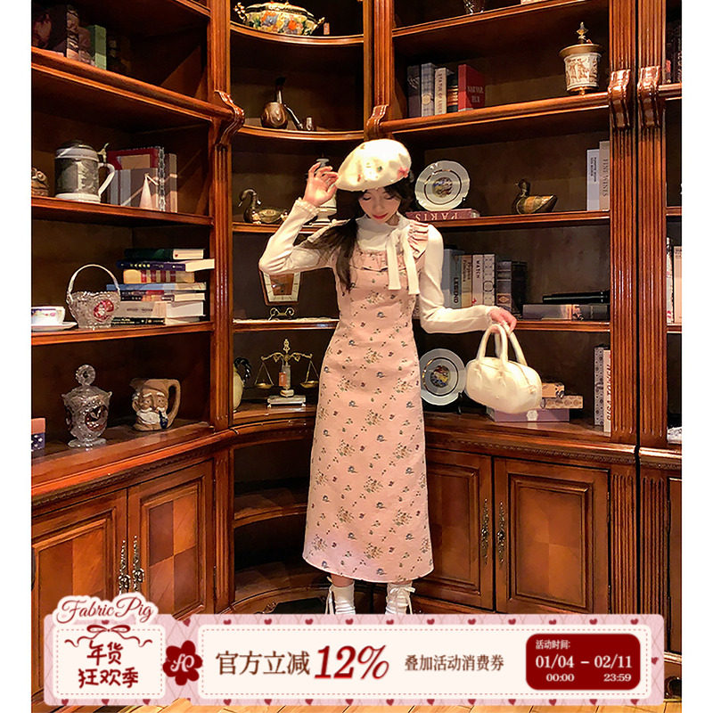 织物猪 樱桃泡芙 法式千金粉色碎花连衣裙女秋冬生日裙假两件长裙