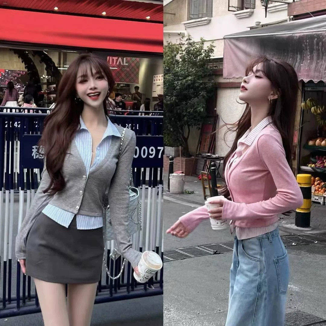 卡卡女装官方旗舰店正品早春新款假两件气质衬衫拼接针织开衫上衣