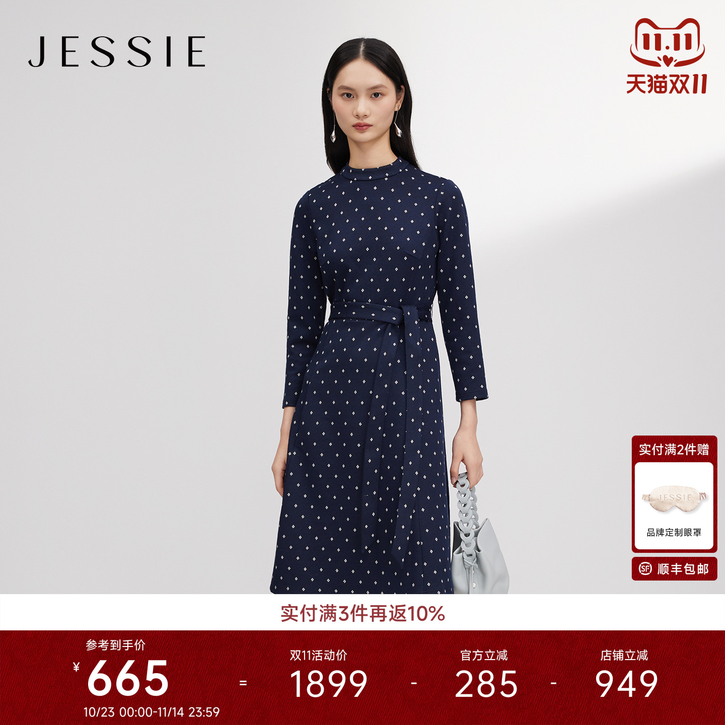 JESSIE复古波点印花连衣裙女士2025年冬季新款系带收腰立领中长款
