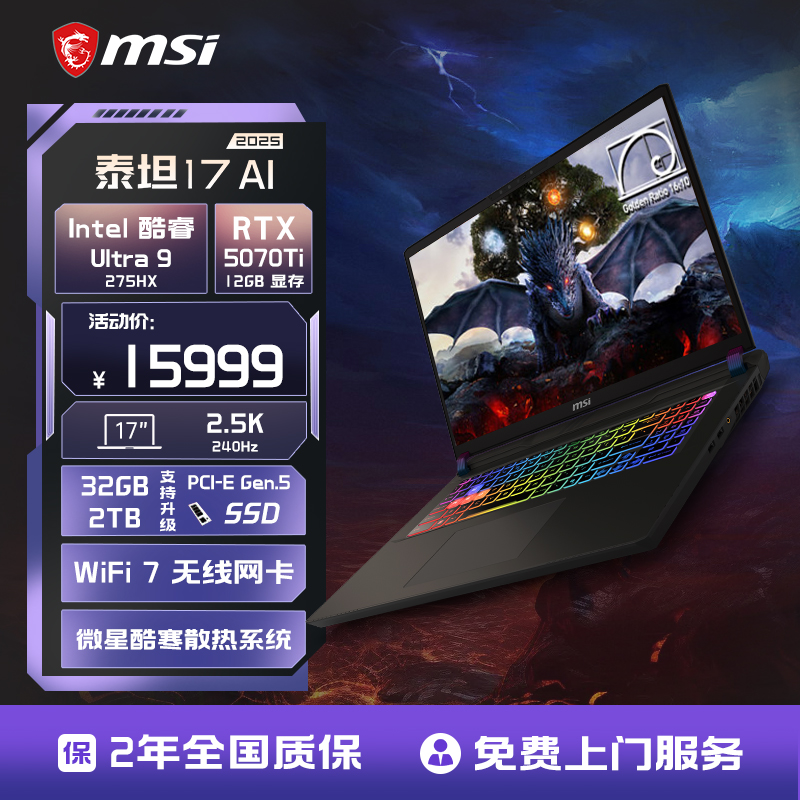 MSI/微星泰坦17 AI 酷睿U9 275HX笔记本电脑RTX5070Ti满血显卡 2.5K240Hz 17英寸大屏游戏本官方旗舰店