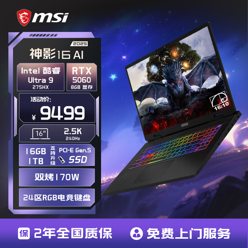 MSI/微星 神影16/17 AI 酷睿U9 275HX 笔记本电脑 RTX5070满血显卡 2.5K240Hz 16英寸电竞游戏本官方旗舰店