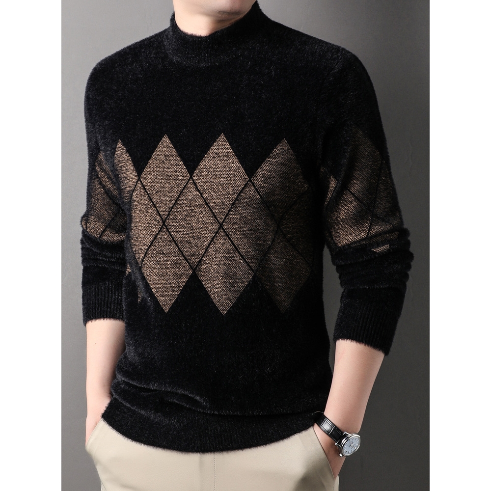 甄选时尚冬季新款中年男士雪貂绒毛衣半高领加绒加厚保暖菱形针织