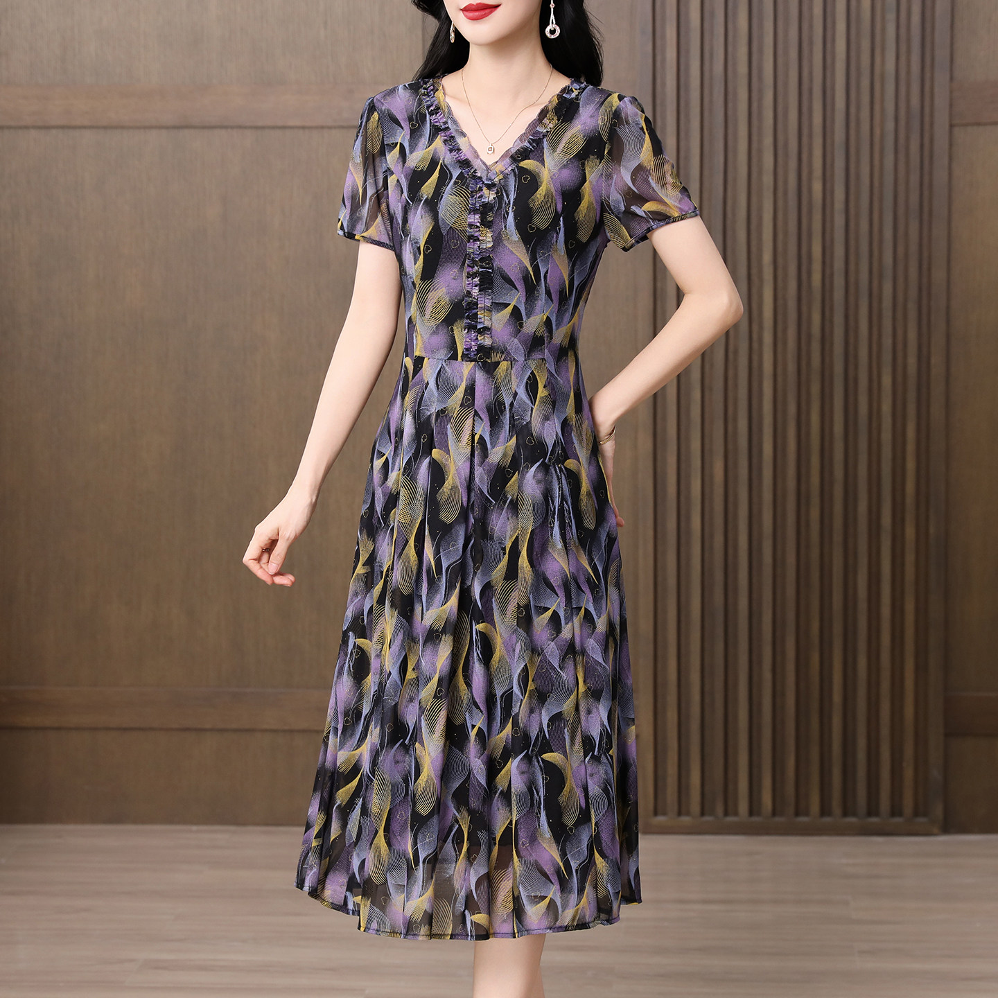 香妮芬洋气v领紫色显瘦中年妈妈减龄连衣裙2025新款夏季短袖裙子